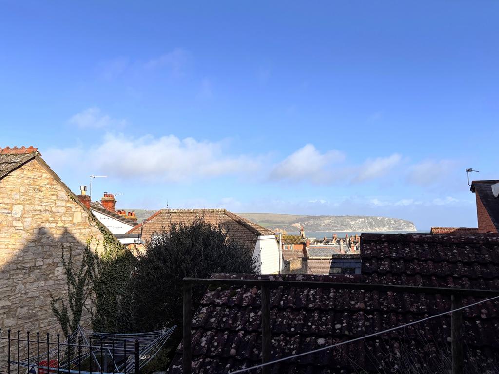 OUTSIDE: Flower/shrub bed to the front of the property. The rear garden is mainly tiled, has a rear pedestrian access, store, and seating area with view over the town to the sea and Ballard Down. Although the property has no parking of its own there is on street parking available on one side of this road and others nearby.