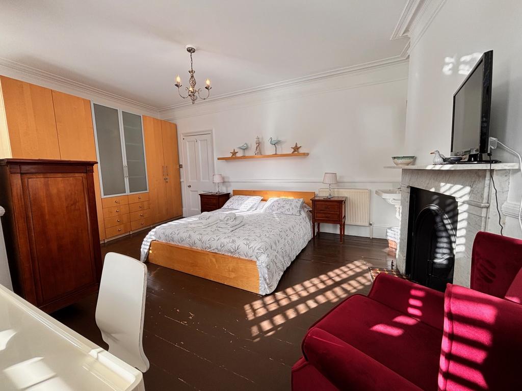 BEDROOM 1 (E): 17’8” (5.38m) x 11’6” (3.5m). Bay window with view of the sea over the rooftops, radiator, wash basin, feature cast iron and marble fireplace, TV aerial point.