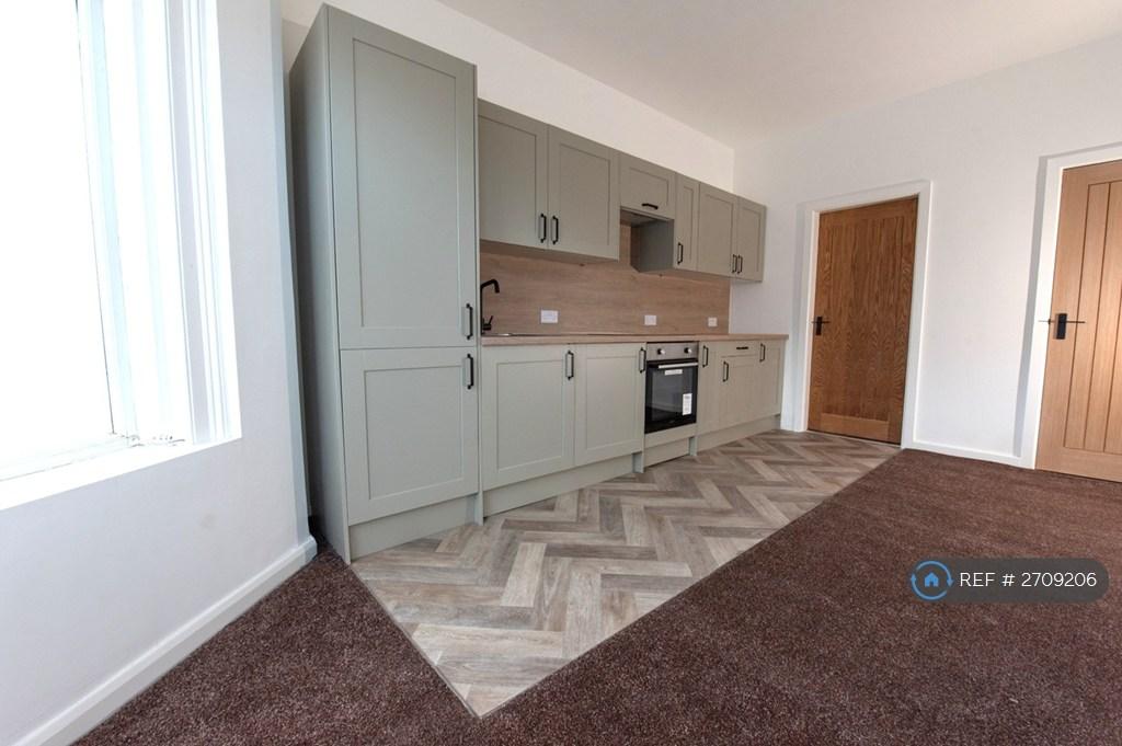 1 bed flat featuring a bright open-plan living area with a stylish fitted kitchen, modern flooring, and large bay windows. The bedroom is spacious with fresh decor, and the bathroom offers a sleek walk-in shower and contemporary fittings. The property also benefits from integrated appliances such as washing machine, fridge freezer, and access to the rear.
