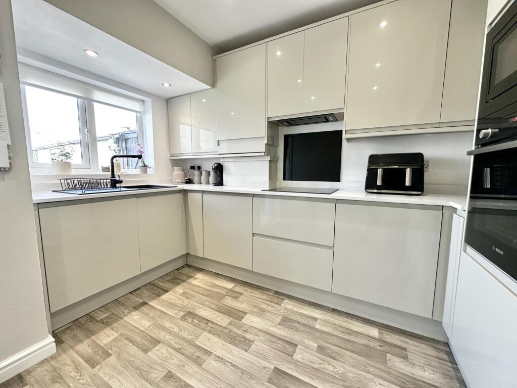A range of wall and base units with complementary work worktops, stainless steel sink with mixt tap, four ring electric hob, electric oven, extractor over, plumbed for a washing machine, integrated fridge freezer, part tiled walls, radiator, UPVC double glazed window to the rear aspect.