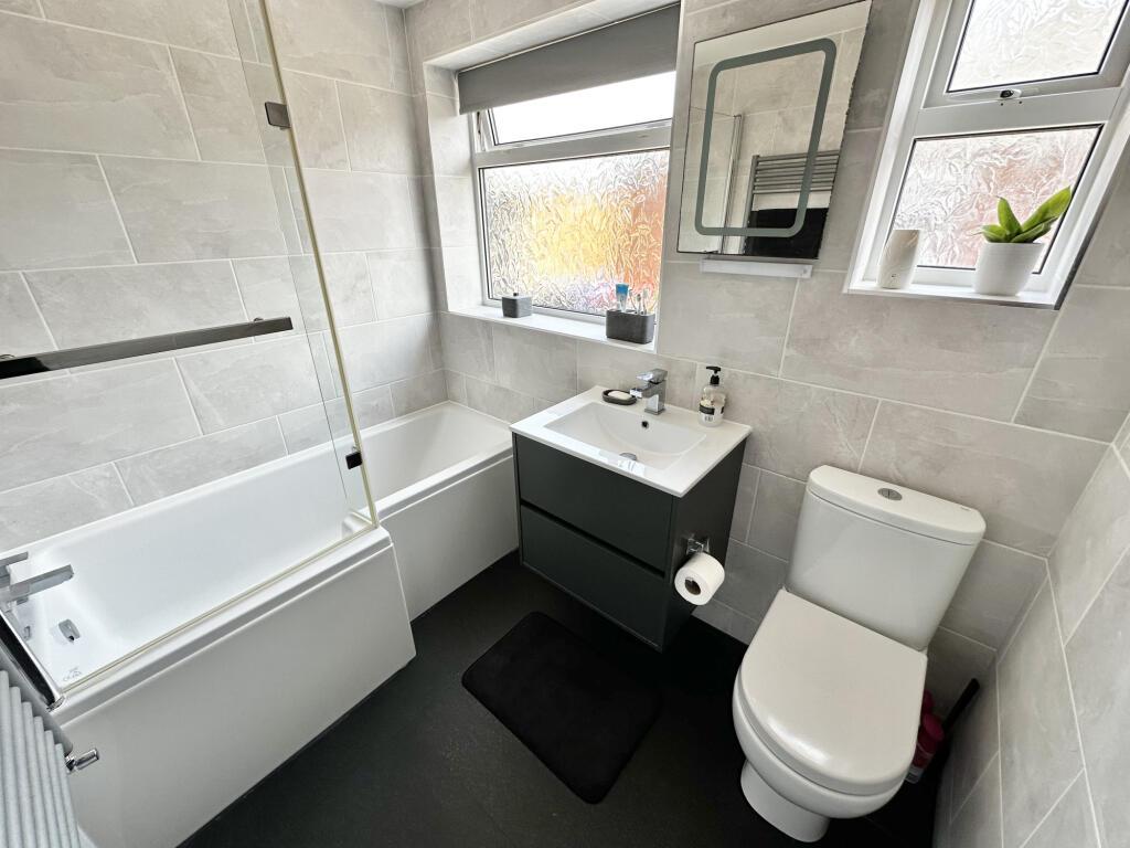 Two UPVC double glazed windows to the side aspect, panelled bath with electric shower over, wash hand basin, low flush wc, heated towel rail, tiled walls and floor.