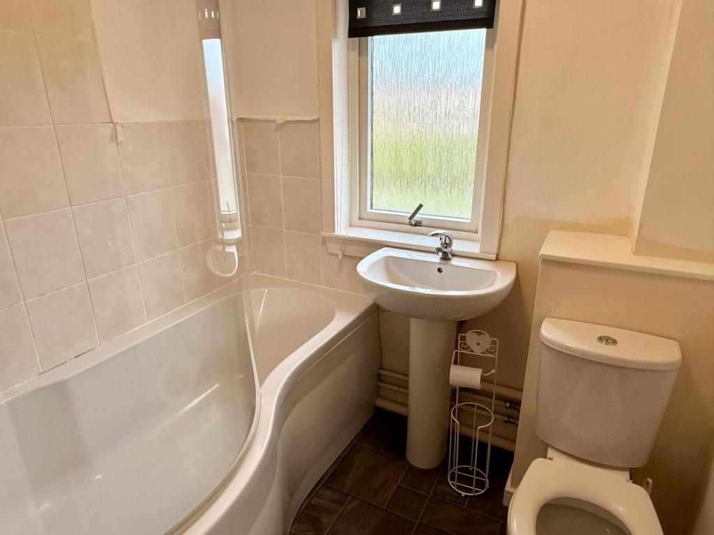 Three piece white suite with shower over the bath. Tiled above the bath. Extractor fan. Heated towel rail. Window to the rear of the property.