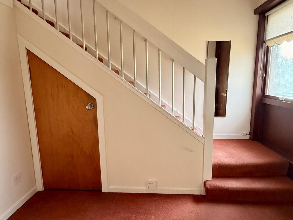 Under stairs storage cupboard housing electric meter and fuse box. Coat cupboard. BT point. Carpeted.
