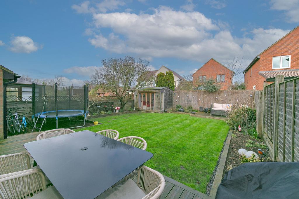 Outside, the beautifully maintained rear garden has been thoughtfully designed to balance relaxation and functionality. A level lawn, mature planting, and raised deck create an inviting backdrop for alfresco dining and summer gatherings. A dedicated platform keeps leisure equipment neatly tucked away, while mature trees add character and seasonal colour. The standout feature is the purpose‑built outside office an invaluable, private workspace perfectly suited to remote working or creative pursuits. A shared block‑paved driveway provides easy access to both the front door and garage, completing this well‑rounded and versatile outdoor space.