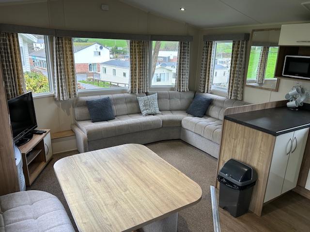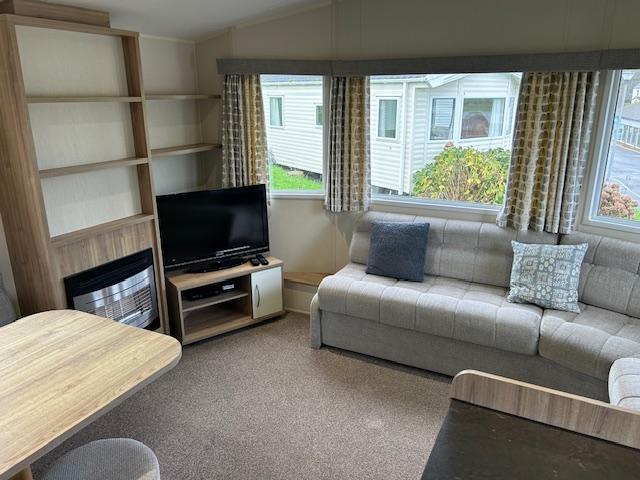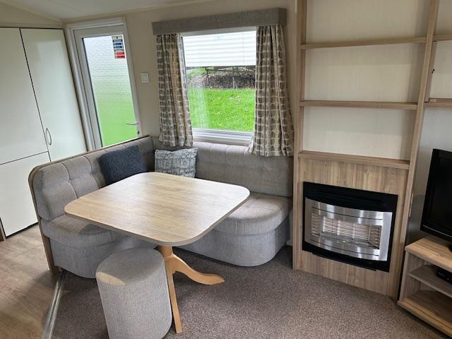 The open-plan lounge offers comfortable wrap-around seating with a handy pull-out sofa bed for visiting family or guests. It’s a bright, relaxing space with a corner TV unit, modern electric fire and shelving to add your own personal touches.