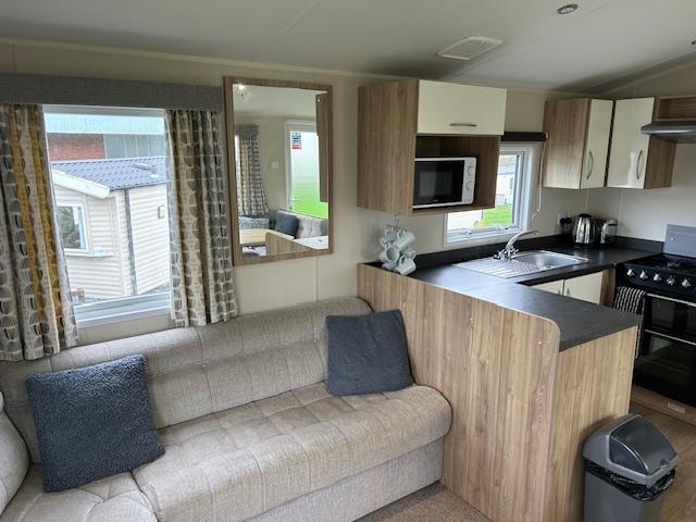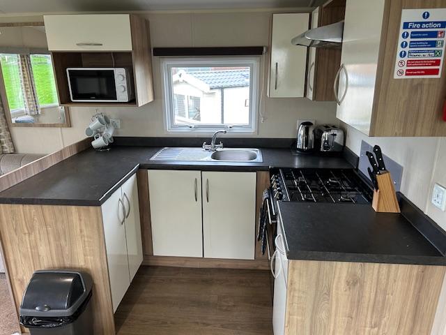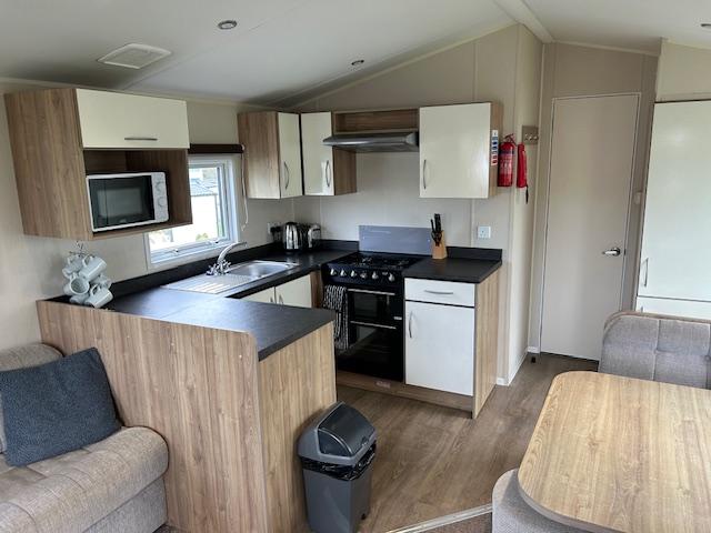 The U-shaped kitchen makes holiday living easy, offering generous cupboard space, modern worktops with matching upstands, integrated appliances and a glass splashback behind the oven and hob.