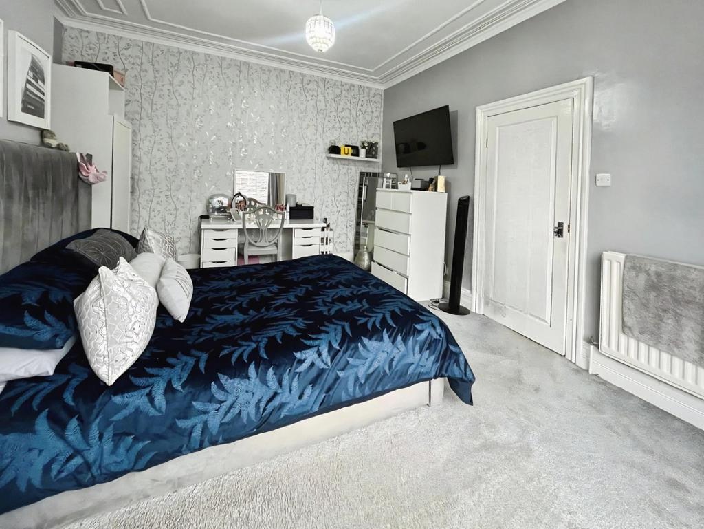 Upon entering the property, you are welcomed by a useful porch area, ideal for storing shoes and coats. The primary bedroom is located to the front of the property and is a spacious, light-filled room featuring high ceilings, light grey décor, and soft grey carpets. A large bay window allows plenty of natural light to flow through the space, and the room comfortably accommodates a king-size bed with additional space for wardrobes, a dressing table, and further storage.