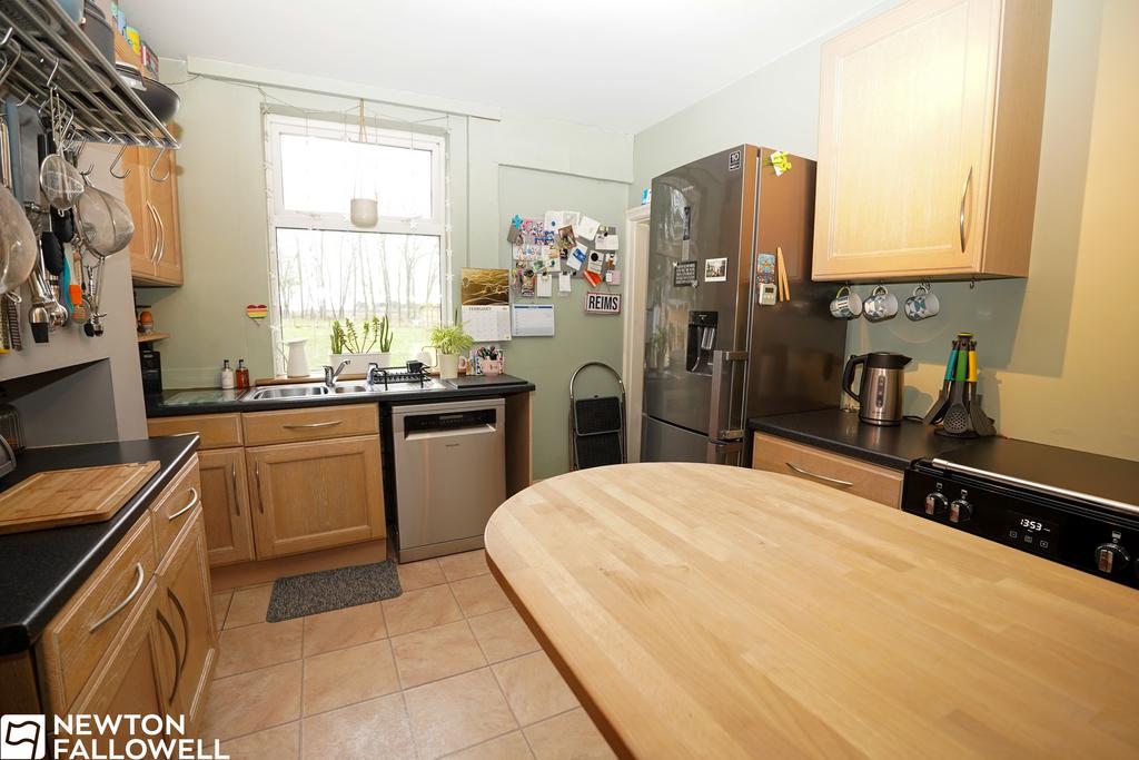 Overlooking the rear garden, the kitchen is fitted with a range of wall and base units, a bowl-and-a-quarter sink with drainer and mixer tap, and space for a freestanding dishwasher, oven, and large fridge-freezer. A raised breakfast-style table offers a spot for informal dining, while the original features and garden views make this a welcoming heart of the home.