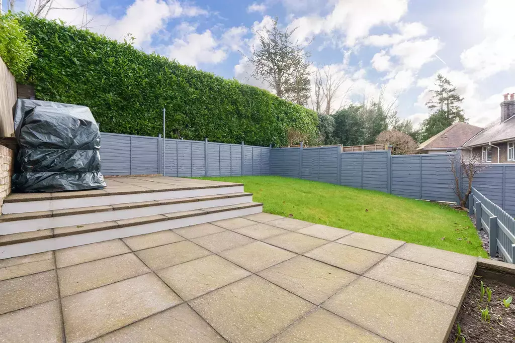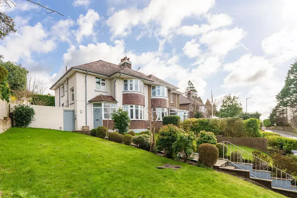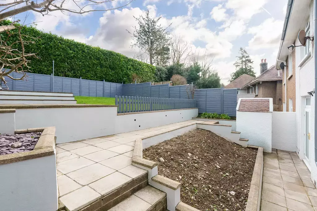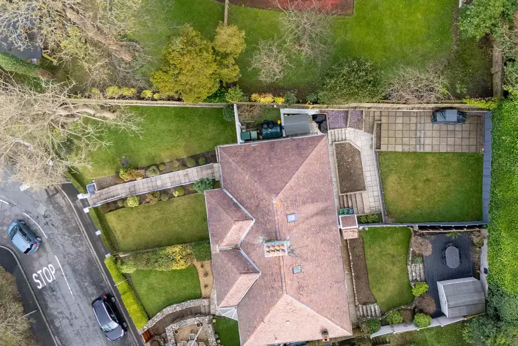 - Extensive plot with superb size front garden with mature trees and shrubs and the rear landscaped garden is tiered with patio areas, lawned garden and a storage shed