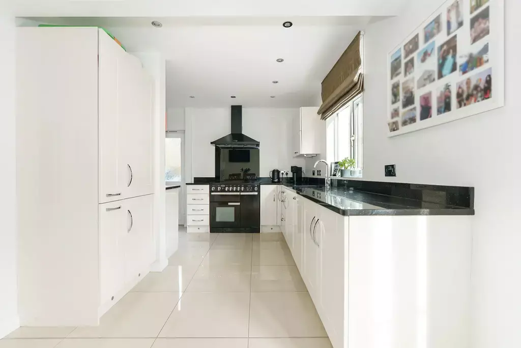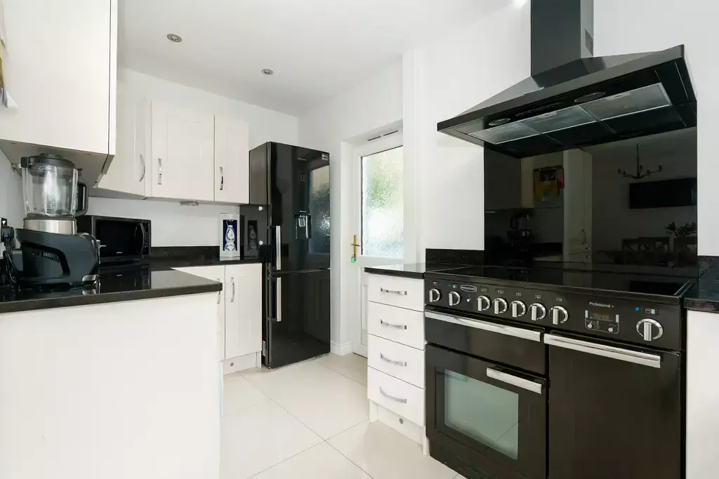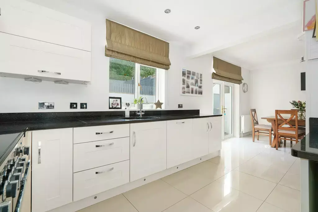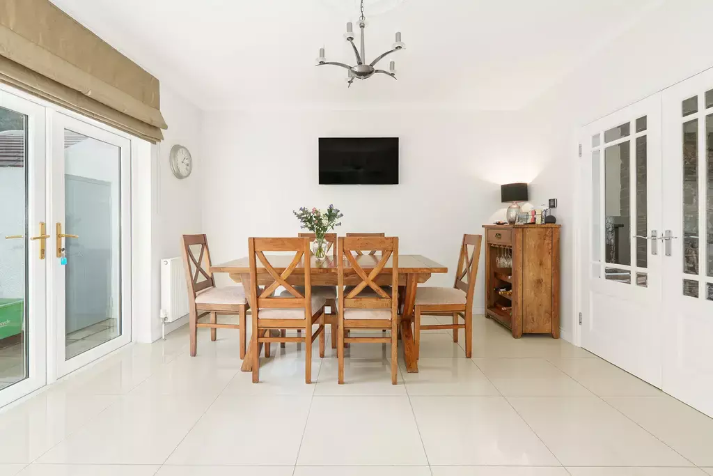 Beautifully presented throughout, the spacious accommodation is ideal for a growing family. An entrance porch leads into a welcoming hallway with a convenient cloakroom (WC). The lovely living room features a curved bay window with far-reaching aspects, creating a bright and elegant reception space, with double doors opening through to a modern and stylish dining kitchen—perfect for entertaining and family gatherings. The kitchen enjoys quality fitments which include Granite worktops, Rangemaster Professional +90 and underfloor heating in the kitchen and dining area.