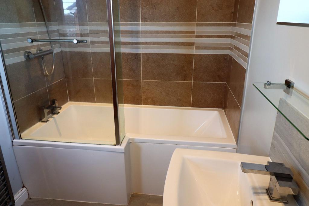 Partly tiled and having window to rear, stainless steel ladder radiator and white three piece suite comprising 'P' shaped bath with mixer tap, thermostatic shower and glazed shower screen, pedestal wash hand basin and WC.