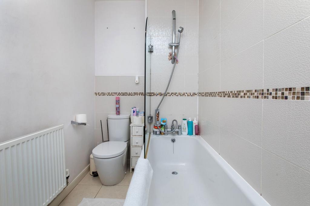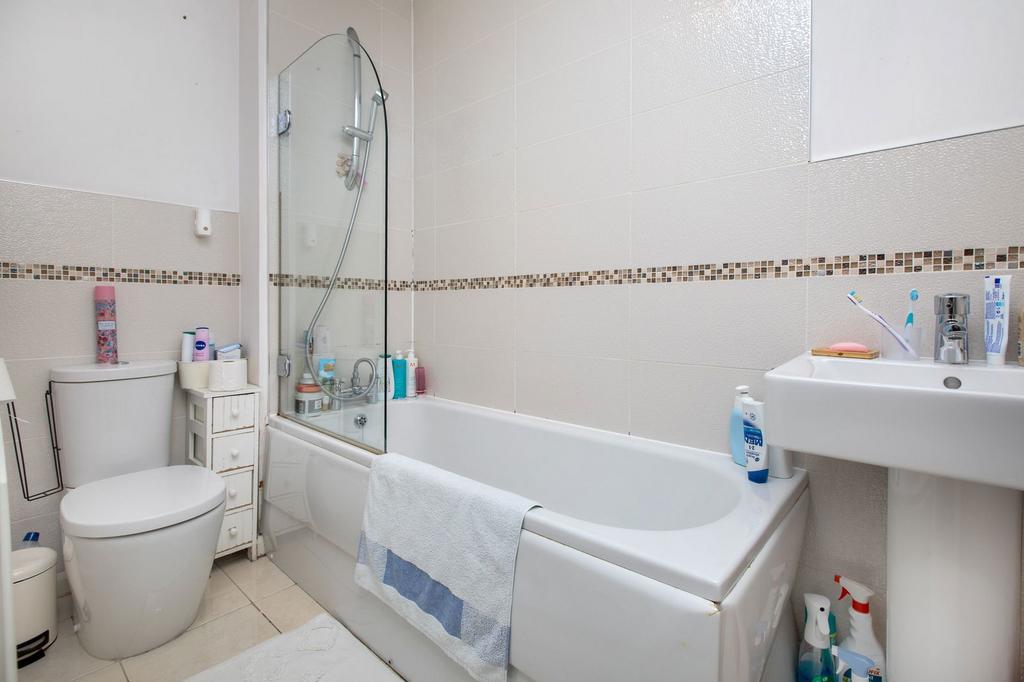 Modern bathroom fitted with a white three piece suite to comprise of a panel enclosed bath with shower attachment, pedestal wash hand basin, close coupled WC and ceramic tiled splash backs.