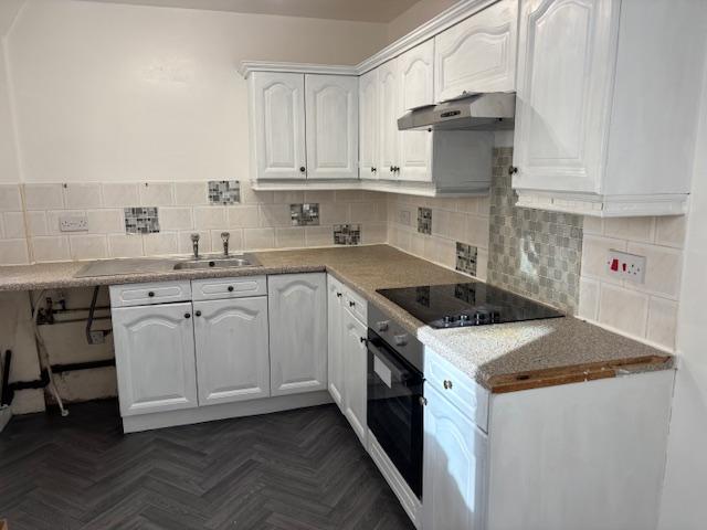 The newly reurbished kitchen is both stylish and highly functional, complete with a range of white shaker-style cabinets, ample worktop space, tiled splashbacks, and modern appliance connectivity including an integrated oven and hob – a perfect setup for any home chef.