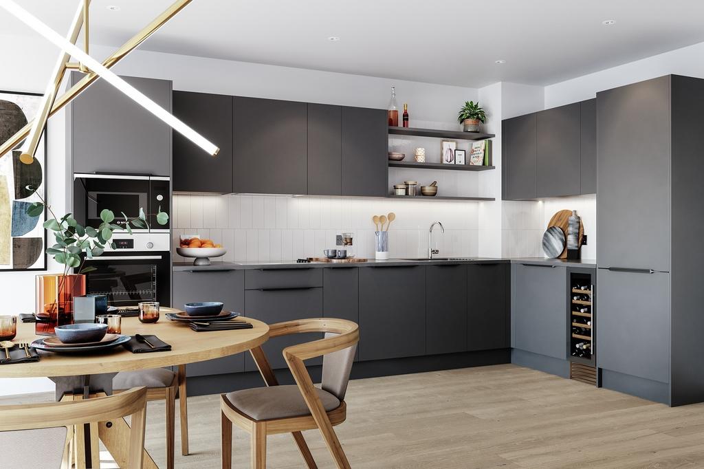 Each kitchen is uniquely crafted with sleek composite stone worktops and beautifully textured ceramic tiled splashbacks, blending style with durability. Fully equipped with premium Bosch appliances such as an oven, hob, and even a sophisticated wine cooler to elevate your entertaining.