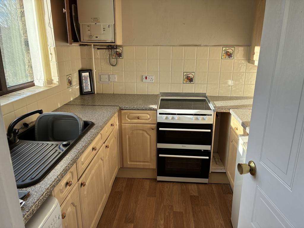 Kitchen (8'10 x 7'10) With fitted base and wall units sink unit with mixer taps, electric oven, gas fired boiler and plumbing for washing machine.