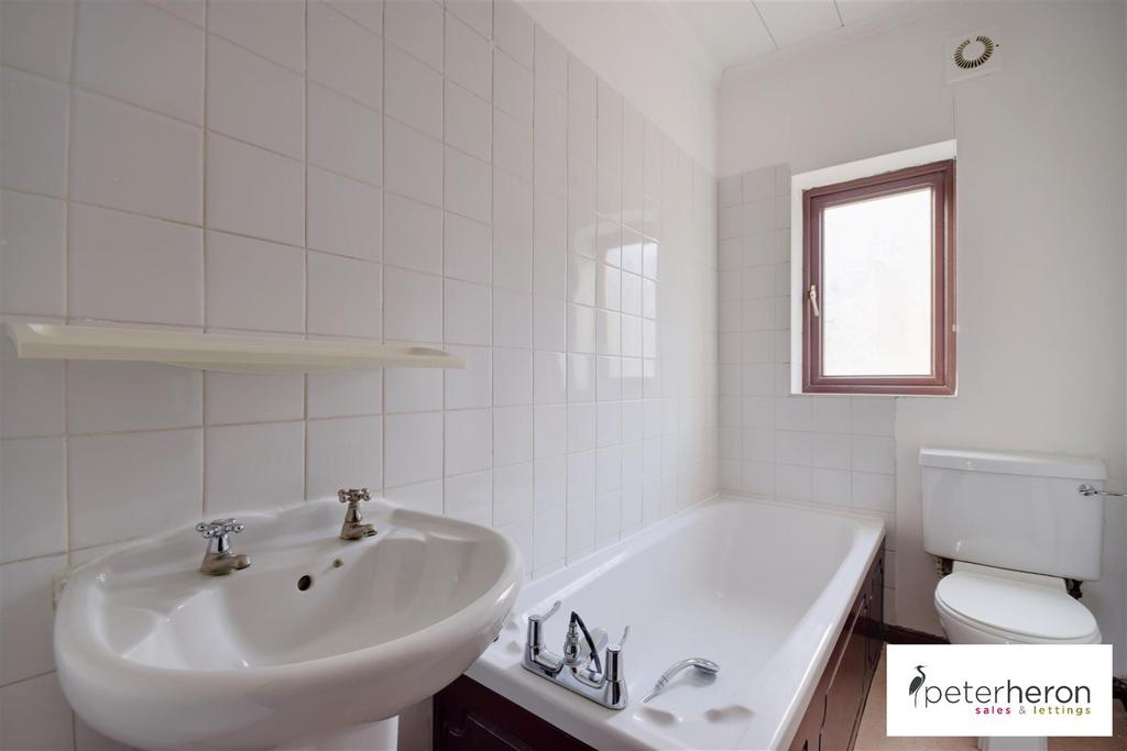 Bathroom - Low level WC, pedestal washbasin and bath, radiator and double glazed window.