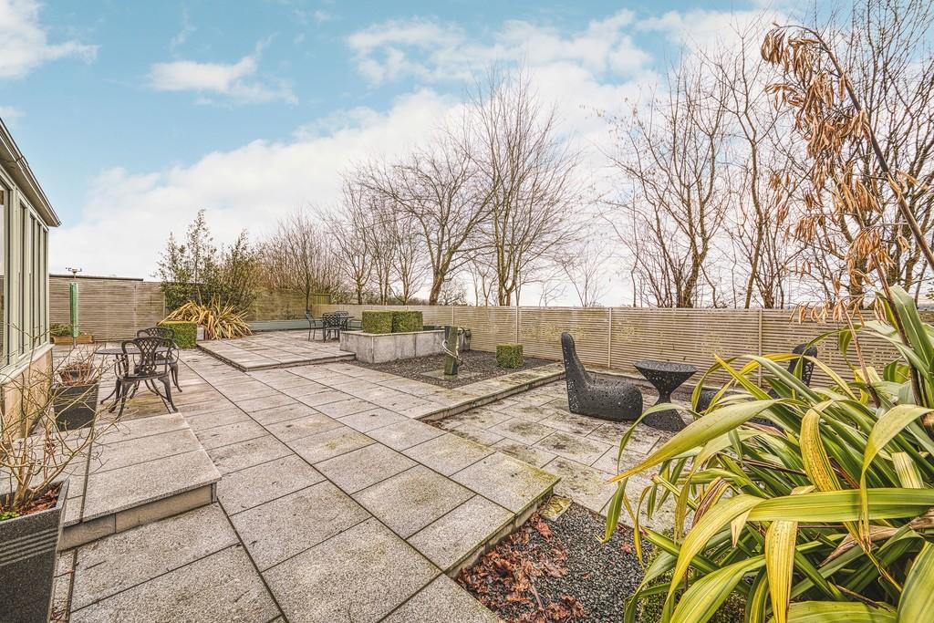 To the rear is a modern landscaped garden with porcelain tiled patio seating area, raised planters and wooden screening, creating a low maintenance and well enclosed space ideal for outdoor entertaining. The garden adjoins open fields and enjoys far reaching countryside views.