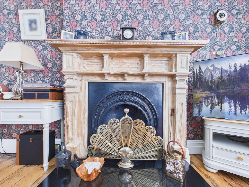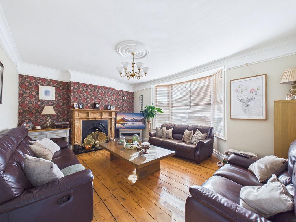 LIVING ROOM An impressively spacious and light filled living room positioned to the front of the property. This welcoming reception space boasts a stunning original coal fireplace with carved wooden mantel and granite hearth, restored original floorboards, a uPVC double glazed bay window and a gas central heating radiator. A TV point is also provided.