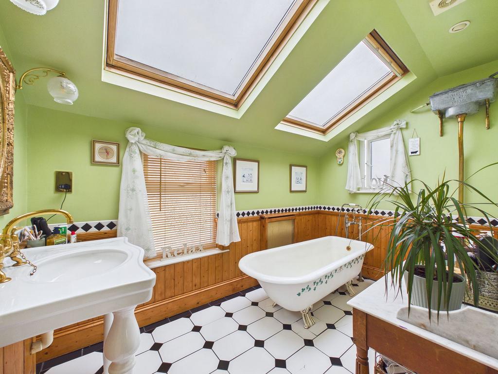 BATHROOM A beautifully styled Victorian inspired bathroom comprising a high level flush WC, vanity wash hand basin and a claw foot freestanding bath. uPVC double glazed windows enjoy stunning sea views across to Berry Head, complemented by additional Velux windows and a gas central heating radiator.