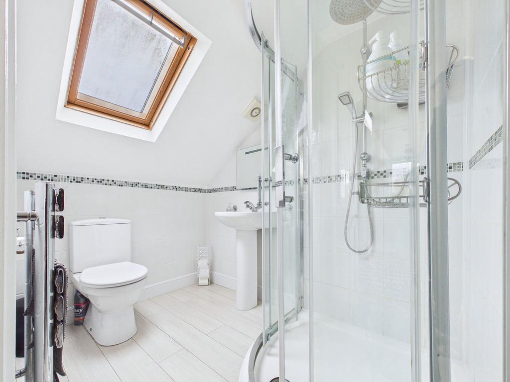 EN-SUITE / WALK-IN WARDROBE A modern en-suite comprising a low level WC, pedestal wash hand basin and walk in corner shower, finished with contemporary tiling. A Velux window provides natural light, and there is a chrome heated towel rail. An archway leads to a useful walk in wardrobe area with hanging space and shelving.