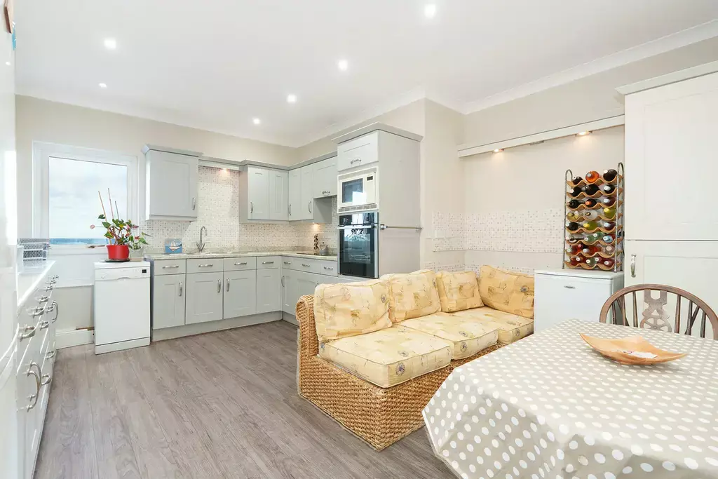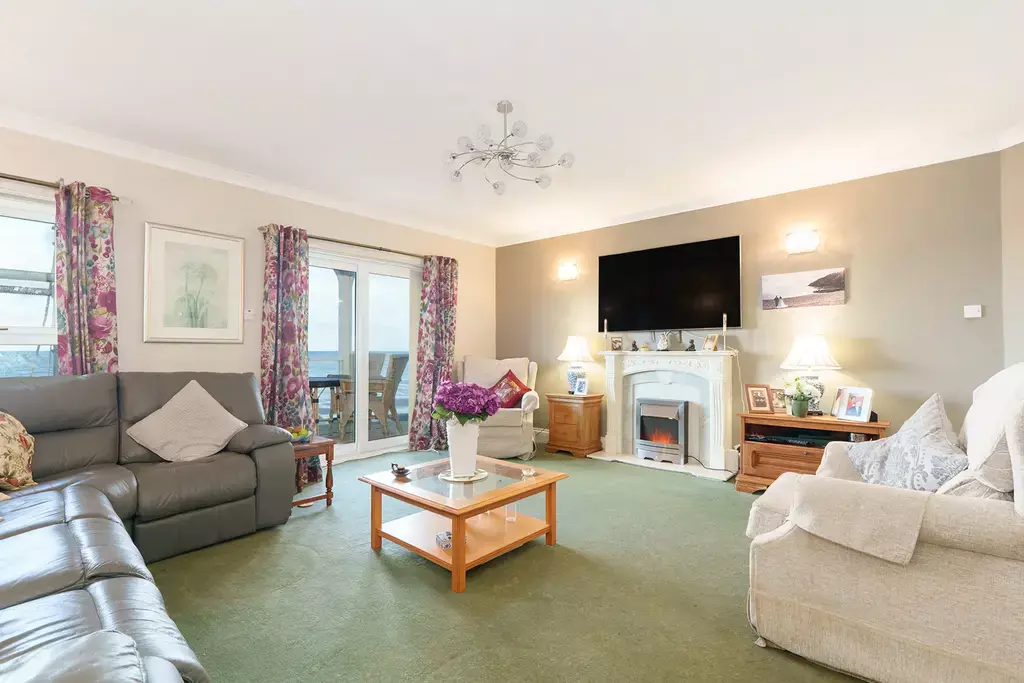 The principal living accommodation is centred around a generous open-plan living and dining room with large balcony, thoughtfully designed to maximise the superb outlook. Large windows frame the bay, creating a bright and uplifting space ideal for both everyday living and entertaining. A separate kitchen/diner provides practicality and functionality.