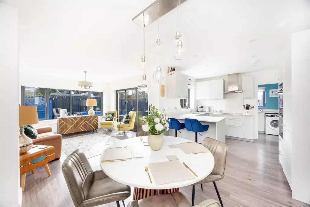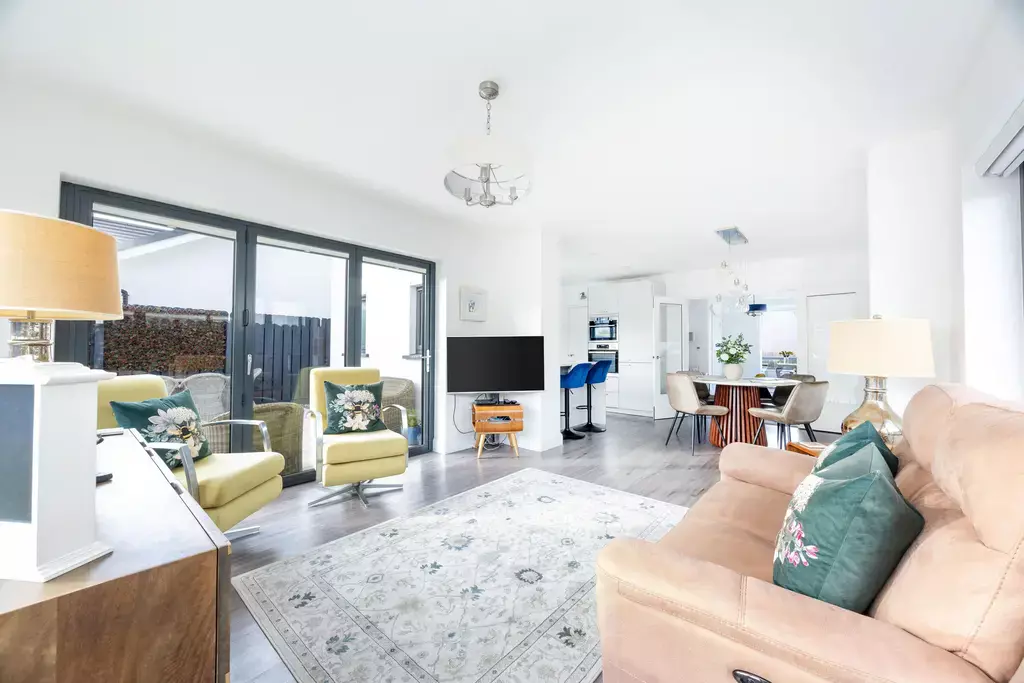 The beautifully presented accommodation is thoughtfully designed for modern family living. There are two separate reception rooms, including a comfortable living room and an impressive sun room with bi-fold doors opening onto the landscaped south-facing rear garden—perfect for indoor-outdoor living and entertaining.