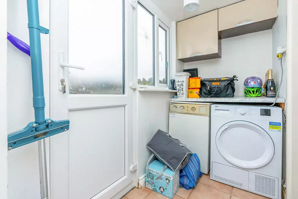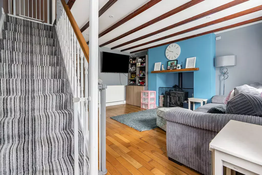 - Characterful living room with exposed stone fireplace, separate kitchen with utility area