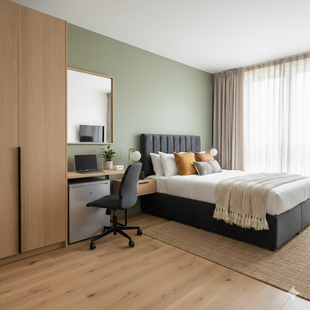 A practical and welcoming space designed for both study and relaxation.