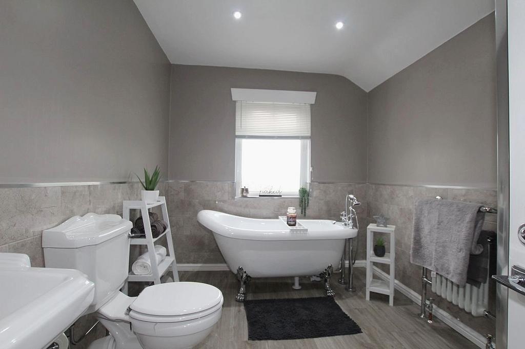 Bathroom: Obscure double-glazed window to rear elevation, four-piece suite comprising wash hand basin, low level WC, free standing roll top bath with shower attachment over, separate shower cubicle, half tiled walls, inset spot lighting and heated towel rail.