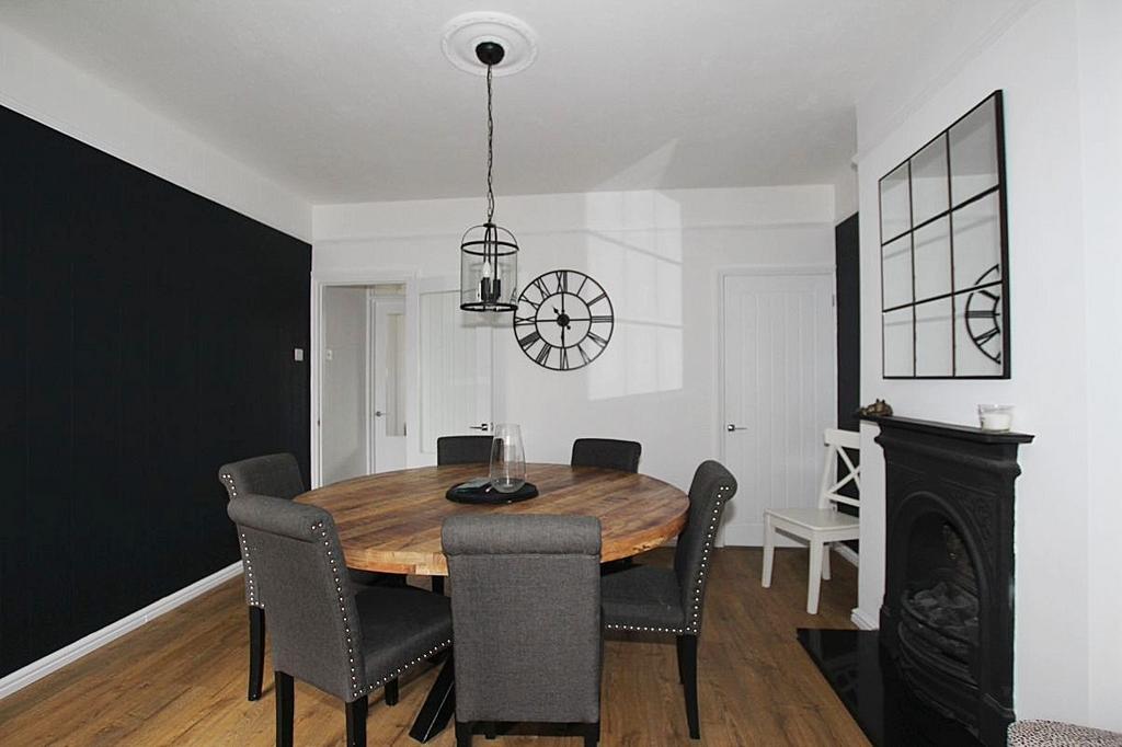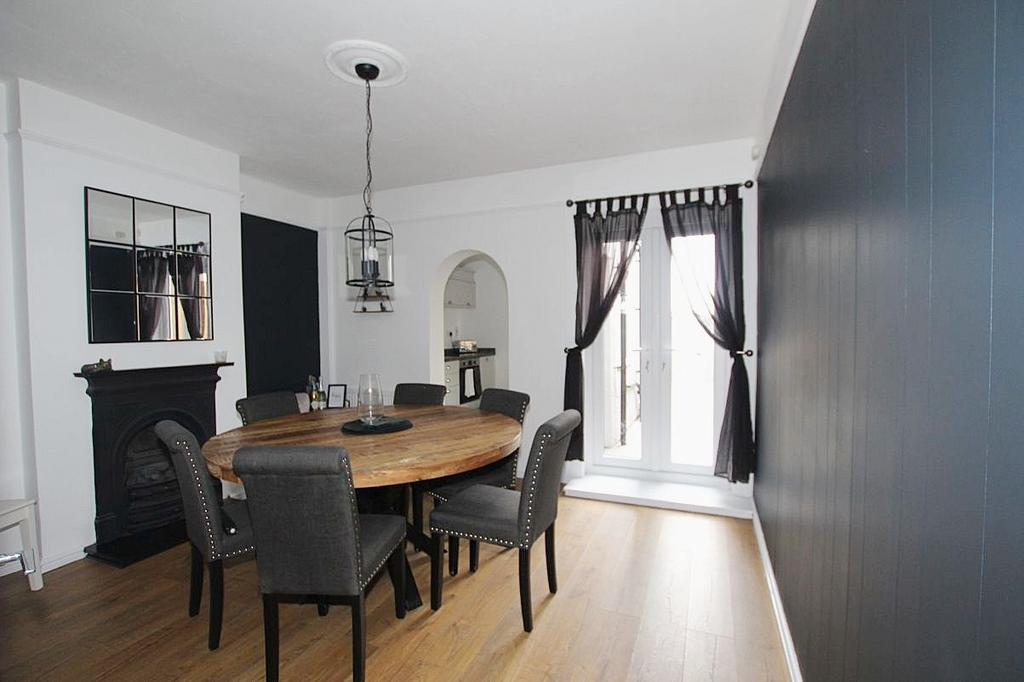 Dining Room 12'11 x 11'10 (3.94m x 2.41m): UPVC French doors leading to the rear garden, feature fireplace with marble plinth, under stairs storage cupboard, laminate flooring, radiator. Archway leading to:
