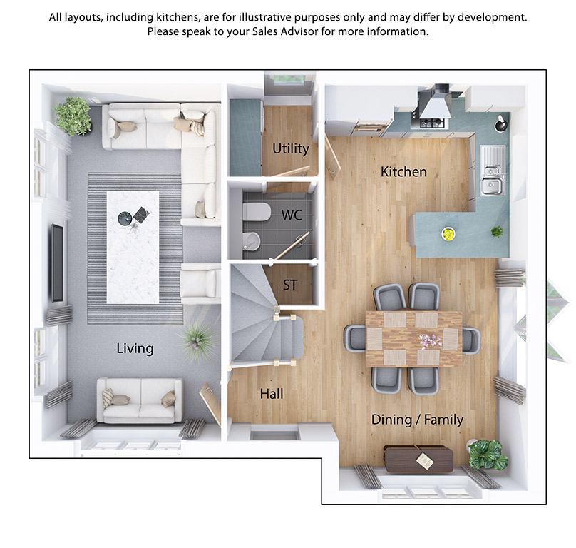 The well-equipped kitchen area is a dream for any home cook, with a practical layout, modern fitted units and integrated appliances. An adjoining, sizeable utility room keeps your laundry appliances conveniently tucked away, maintaining the open and airy feel of the ground floor.