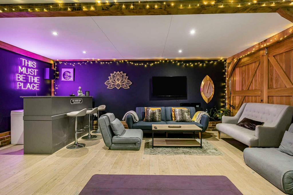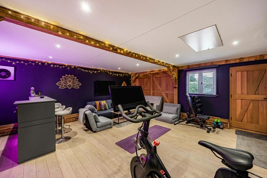 The property is approached via electric wooden gates that open onto a pebble driveway leading up to the house and providing ample parking. There is also an impressive outbuilding, currently used as a gym/studio, offering a versatile additional space and benefiting from full electrical connection.