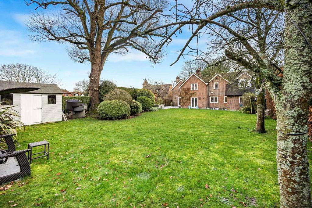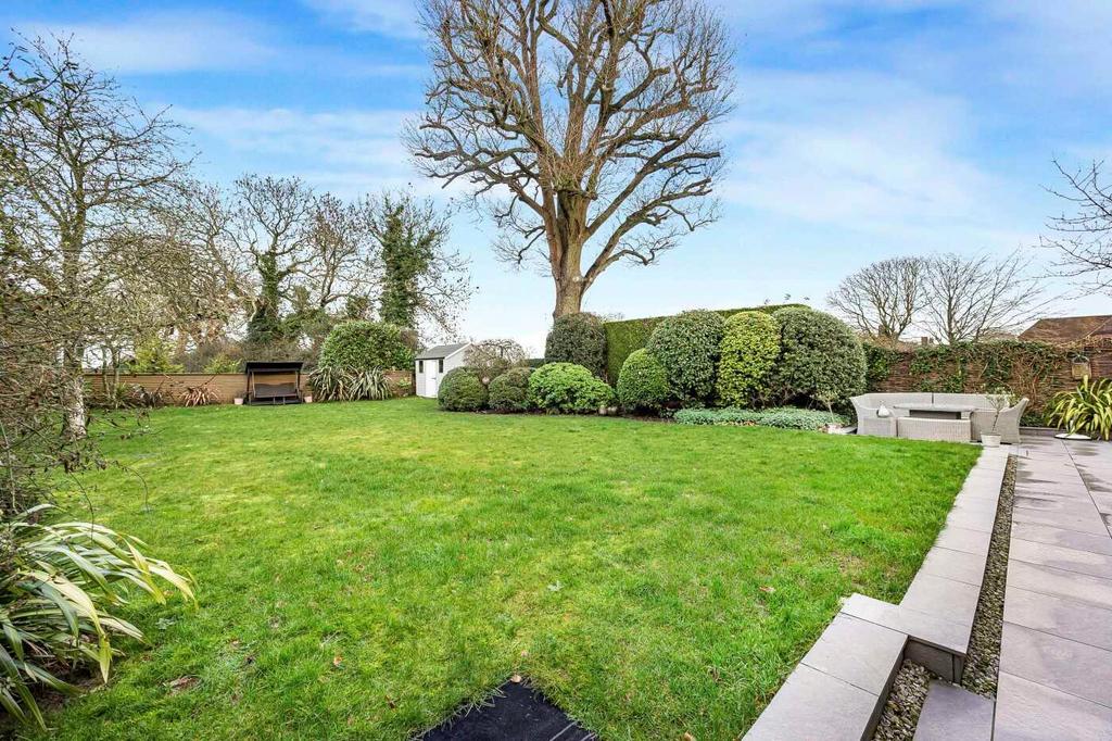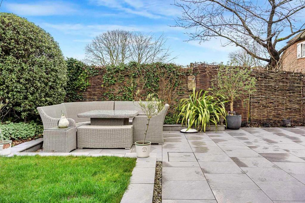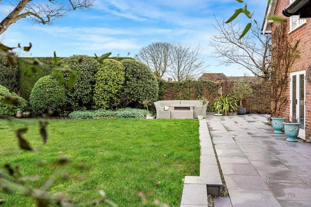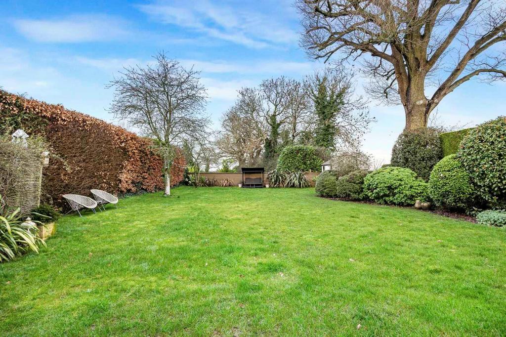 The kitchen/breakfast room opens onto the rear garden through French doors, leading to a beautifully landscaped area with a patio and generous lawn, all bordered by mature shrubs and trees that create a wonderfully private setting.
