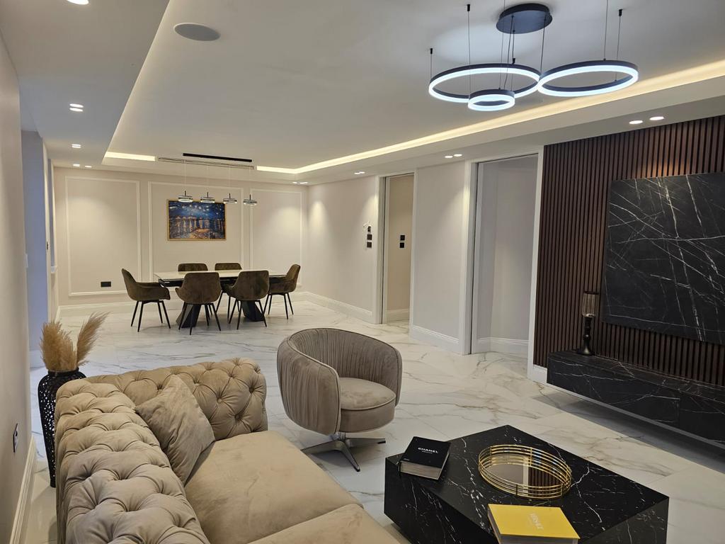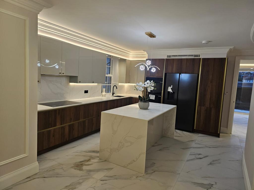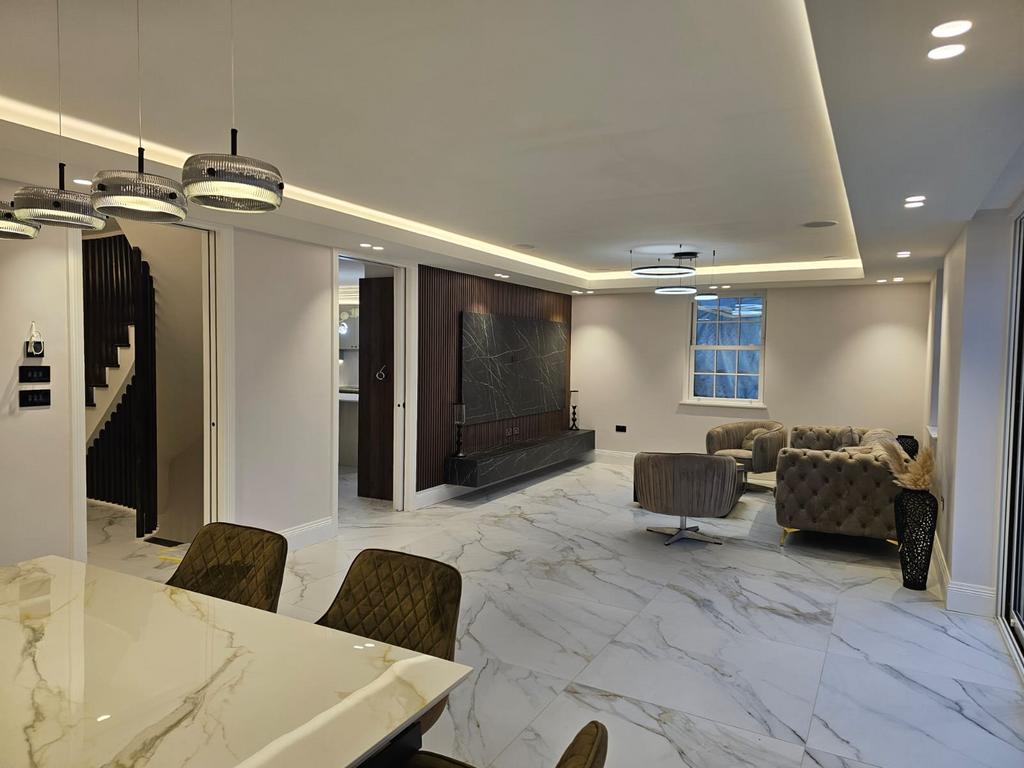 The ground floor features a striking entrance hall leading to a series of elegant reception spaces, complemented by a spectacular open-plan kitchen, dining and family area. The kitchen is fitted with top-of-the-range integrated appliances, bespoke cabinetry, premium stone worktops, and sleek contemporary finishes — creating a perfect balance of style and functionality.