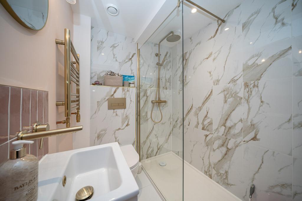 Upstairs are two bedrooms and a stunning shower room and access to a boarded loft with a velux window.