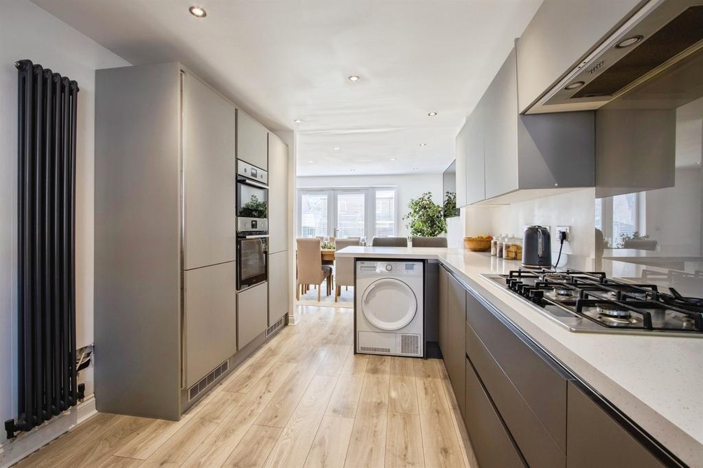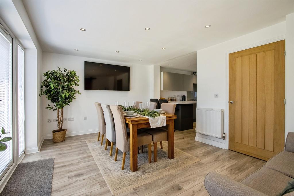 The open-plan kitchen and dining room offers a modern and sleek space, perfect for both everyday living and entertaining. The kitchen is fully fitted with stylish wall and base units, integrated appliances, and features a front-facing window that brings in natural light. Finished with contemporary spotlights, the space feels bright and welcoming.