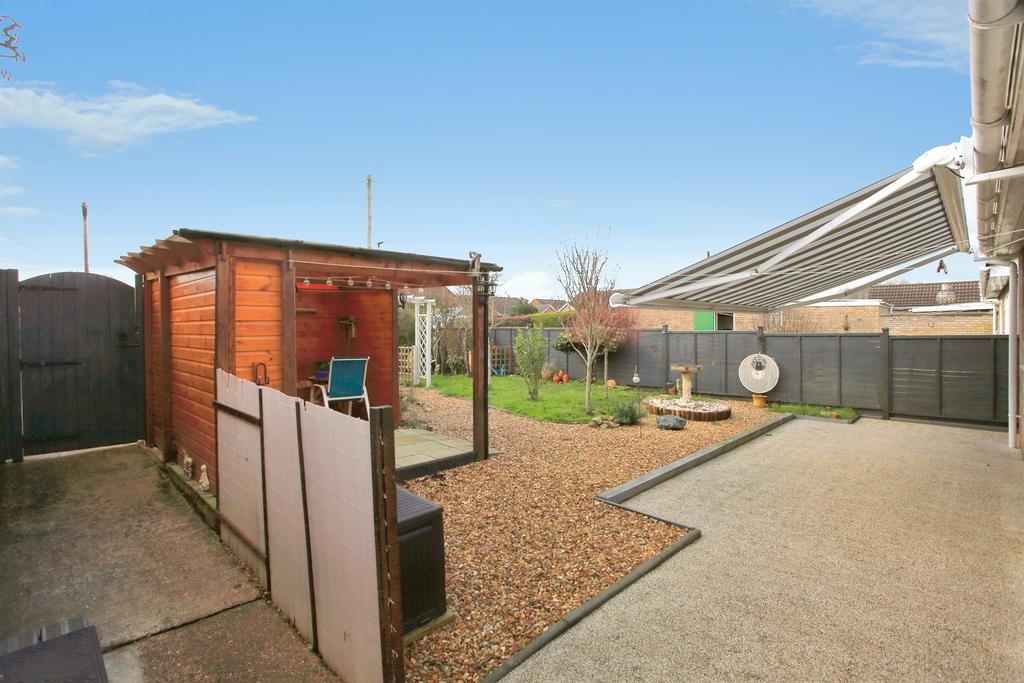 REAR GARDEN: Enclosed by fencing. Access gate. Laid to lawn area with shrub borders. Paved area. Decorative gravel area. Shed. Covered pergola.