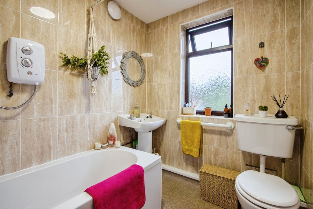 Bathroom incorporating bath with new electric shower over, washing hand basin, W/C, central heating radiator.