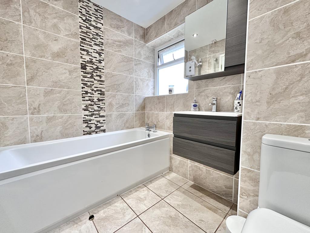 The bathroom has fully tiled walls and floor, a bath with shower over and glass shower screen, wash hand basin with vanity unit, WC and towel rail.