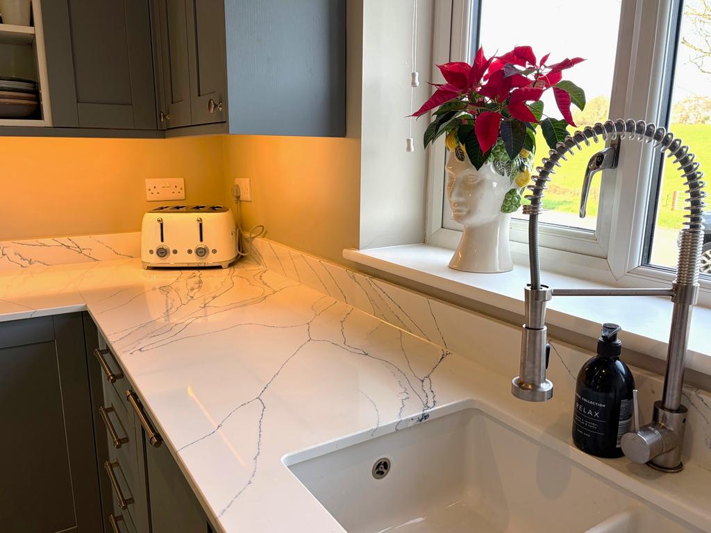 KITCHEN (S & N): 17’10” (5.45m) x 9’3” (2.82m). Shelved store cupboard, radiator, single drainer sink unit with mixer tap and marble effect work surfaces with integrated washing machine cupboards, integrated slimline dishwasher, and drawers under, integrated fridge and freezer, electric oven and induction hob with filter hood over, wall cupboards.