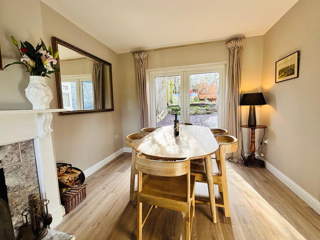 LOUNGE/DINER (S & N): 17’10” (5.45m) x 10’1” (3.07m) max. Open fireplace with marble hearth and surround, wooden mantle, TV point, rural and hill views, radiator, dining space with double glazed doors to the rear garden.
