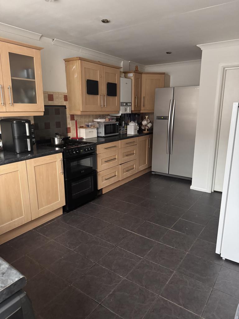 Spacious kitchen with oak style fittings, gas cooker and tiled flooring