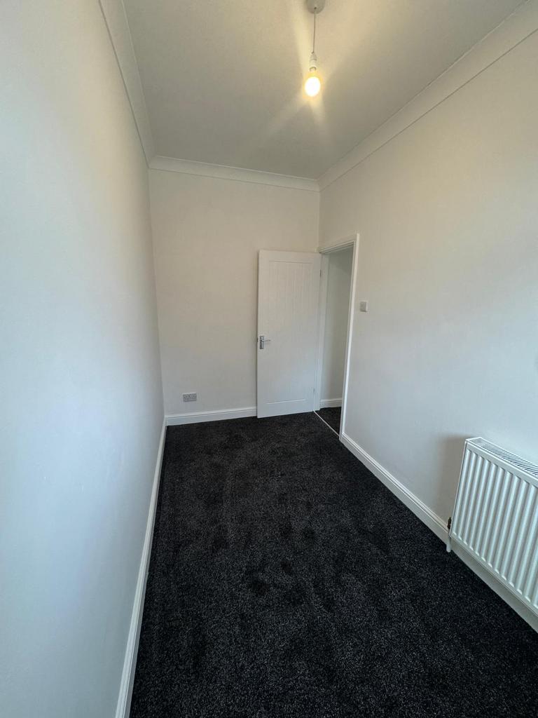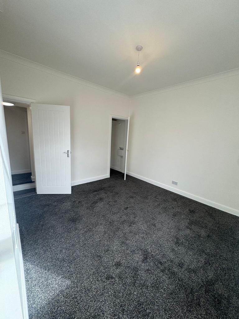 Larger than average double bedroom, again with white plastered walls and new charcoal coloured carpet to floor. White venetian blind to window.