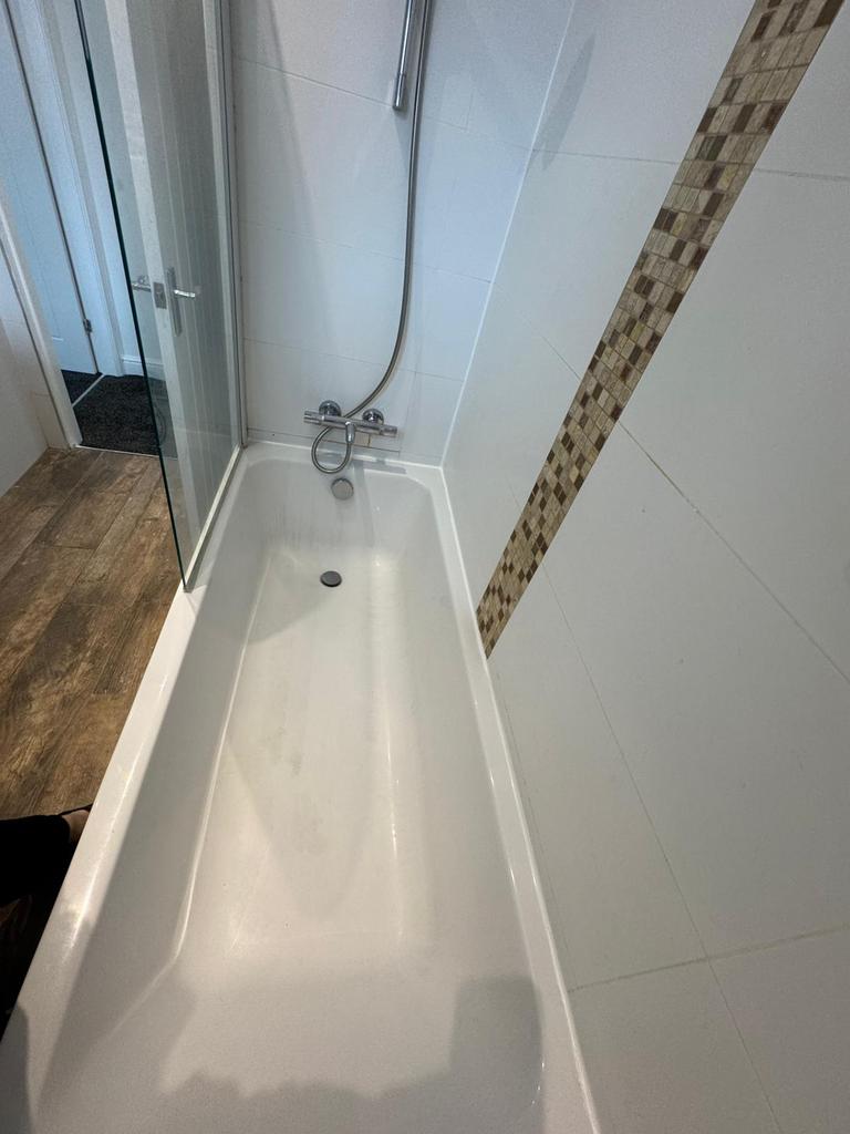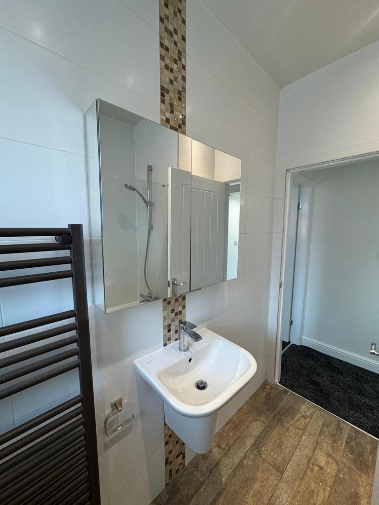 Fully tiled modern square-look bathroom with white 3 piece suite comprising of a wall-hung basin with mono tap, with over-sink double mirror cabinet to wall; back-to-wall toilet, and bath with over-bath power shower and glass shower screen. Black ladder radiator and complementary wood-effect lino to the floor.