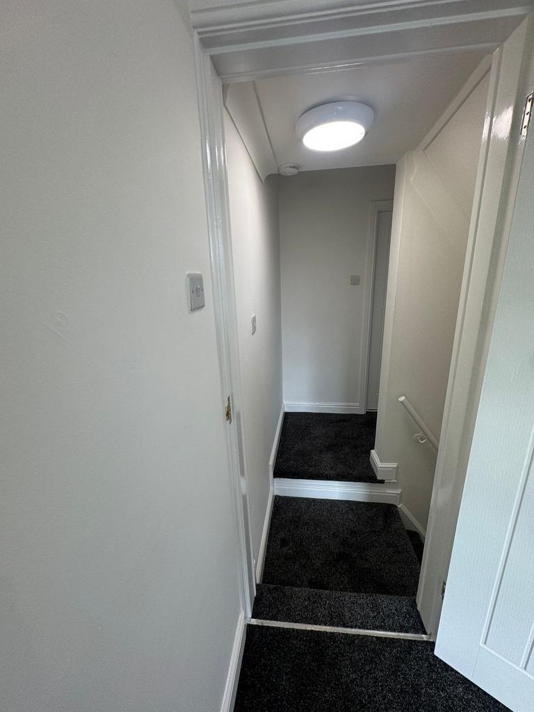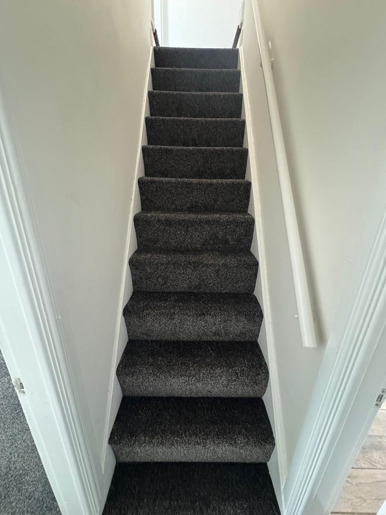 Access to upstairs via newly-carpeted staircase into: