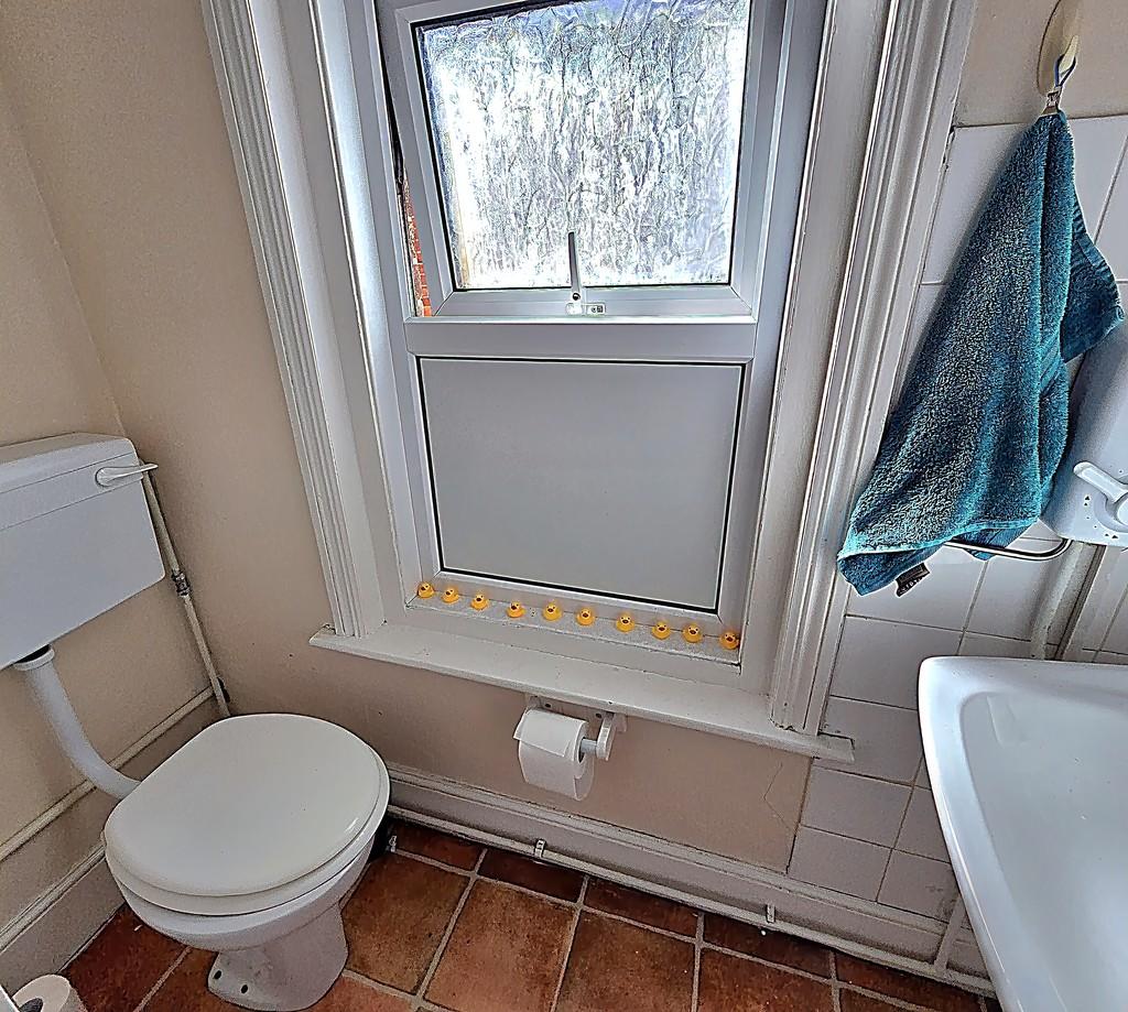 WC, wash hand basin, extractor fan, bath with overhead shower, double radiator, glazed window to side aspect.