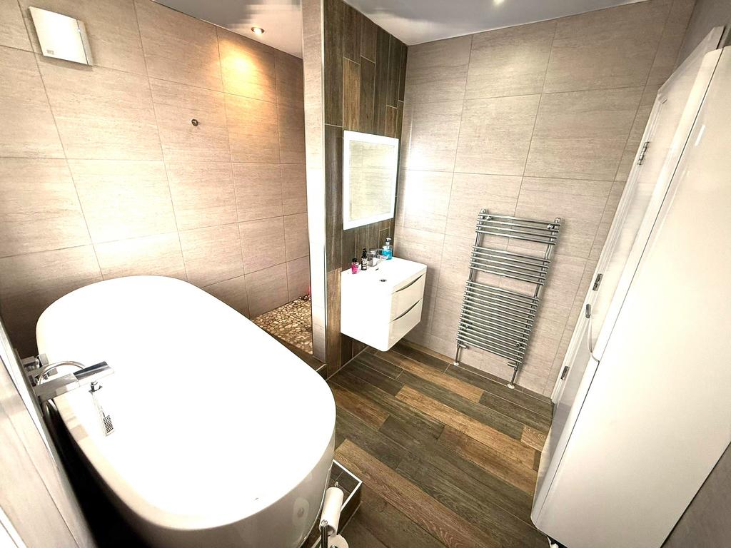 The bathroom showcases modern design with large beige tiles covering the walls and dark wood-effect flooring. It features a freestanding white bathtub and a floating vanity unit beneath a well-lit mirror. A heated towel rail and a walk-in shower complete this stylish and functional space, offering a relaxing environment.