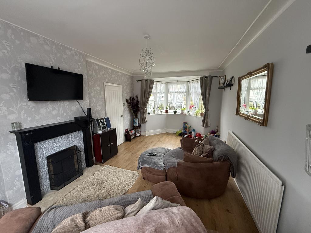 This inviting living room features a spacious layout with a bay window that allows natural light to fill the room. The room is enhanced by a fireplace with a decorative surround, creating a cosy focal point. Wood-effect flooring adds warmth underfoot, and neutral walls provide a calm backdrop, making this space perfect for relaxing or entertaining.