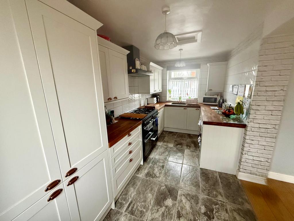 The kitchen is well-equipped with a range of white cabinets offering plentiful storage, complemented by wooden work surfaces. The layout includes a freestanding oven and space for appliances, with tiled flooring that is both practical and stylish. A window at the end of the room allows daylight to stream in, brightening the space.