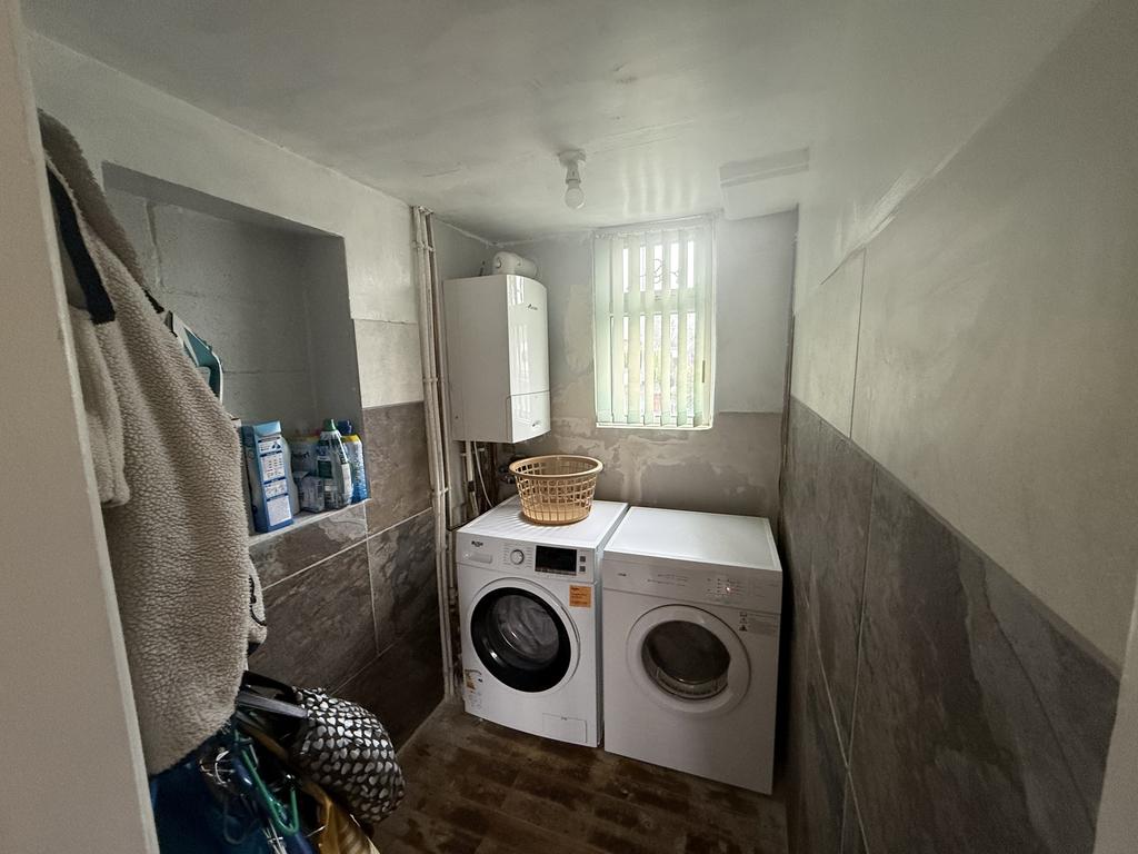 This utility room is functional and well-organised, featuring space for both a washing machine and dryer. A window allows natural light to enter, and the room includes wall-mounted boiler and storage shelves for laundry essentials.